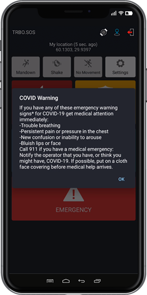 Este novo aplicativo móvel transforma seu smartphone Android ou iOS em um dispositivo de segurança pessoal. O software possui uma interface de usuário (UI) simples e limpa, com grandes botões programáveis. Projetado para funcionar em situações perigosas quando cada minuto importa, TRBO.SOS permite enviar um alerta para o despachador instantaneamente.